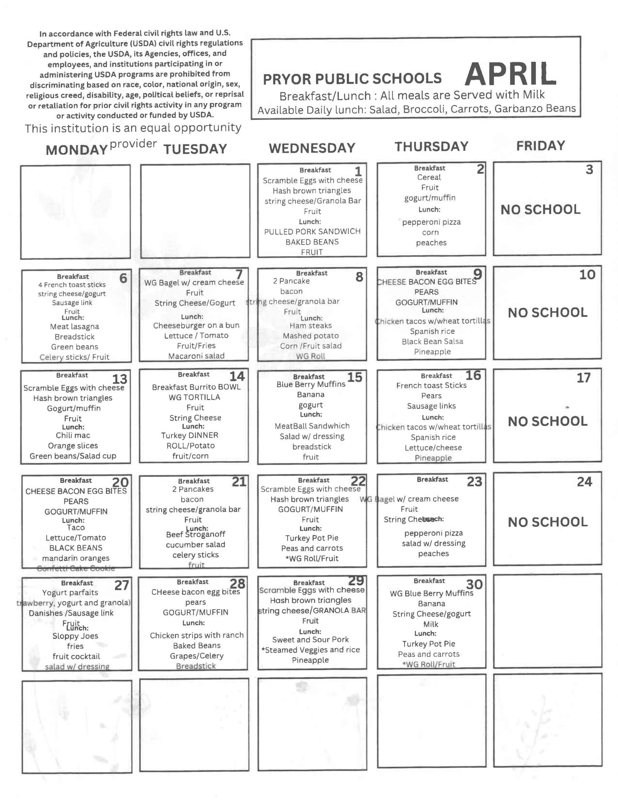 Adult Meal Cost Pryor Public Schools